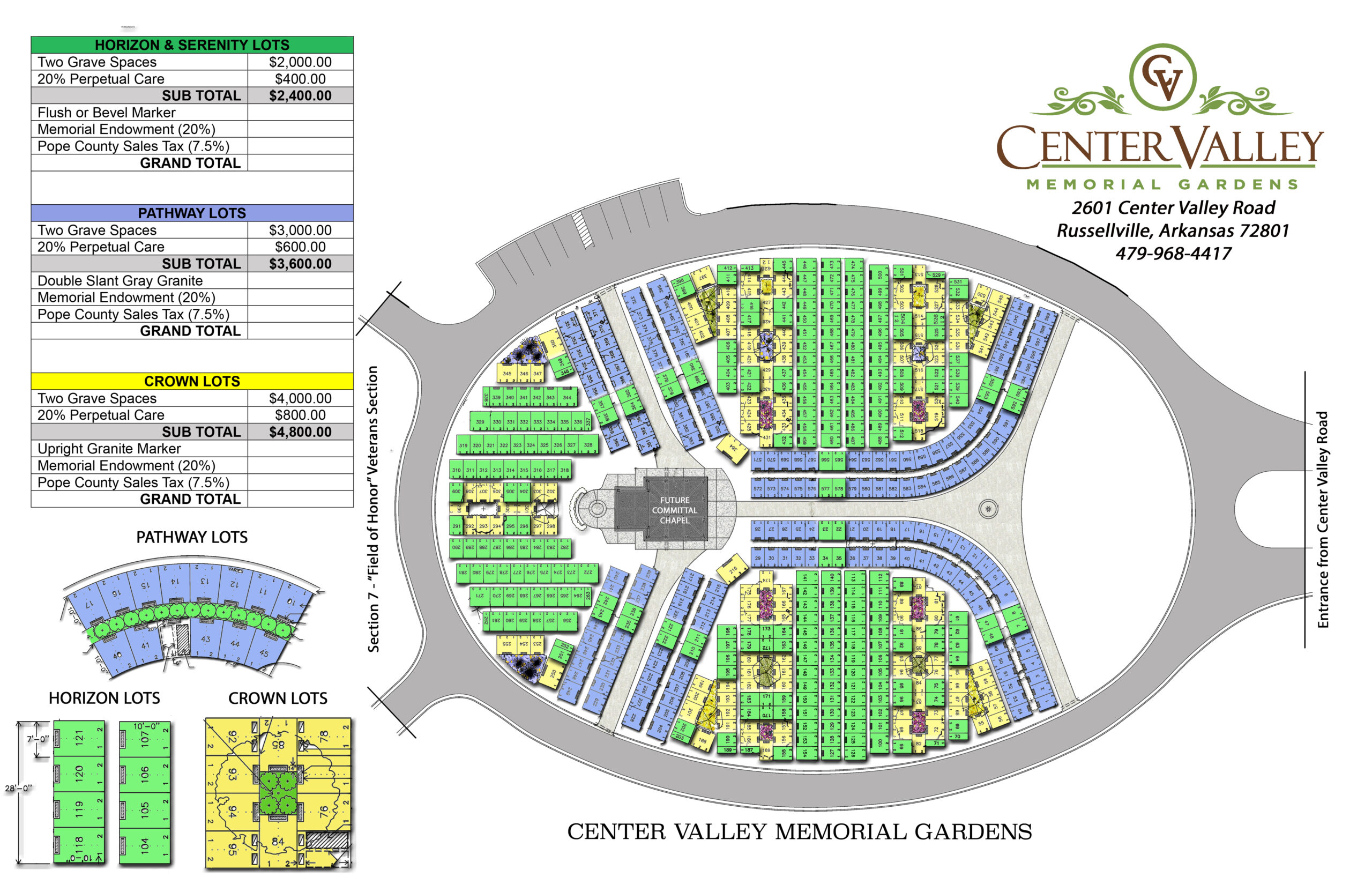 A perpetual care cemetery nestled in the Arkansas River Valley countryside, Center Valley Memorial Gardens amenities include professionally manicured grounds with automated sprinkler system to ensure lush greens for all of our clients.